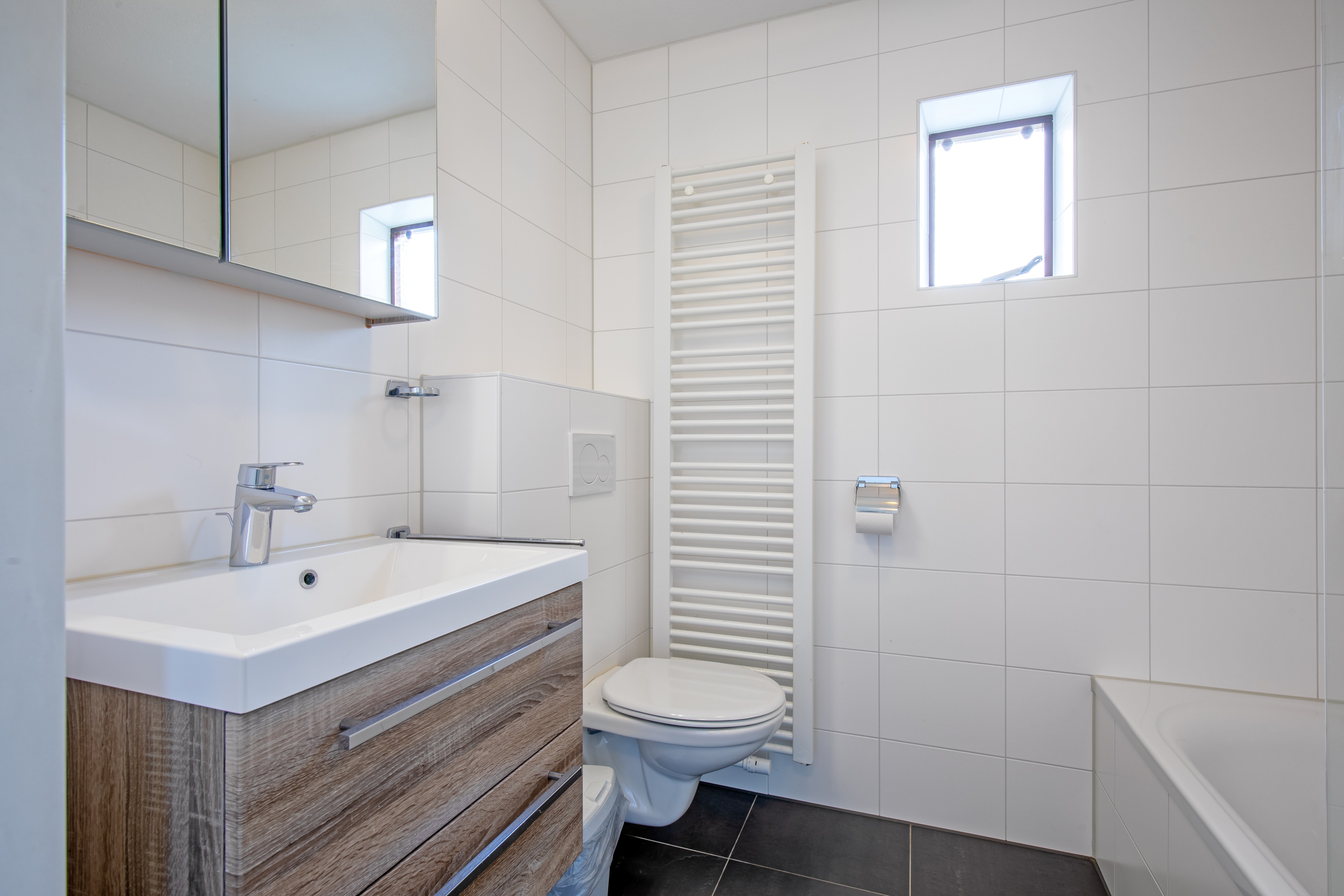 Op de begane grond een badkamer met bad, toilet en wastafel