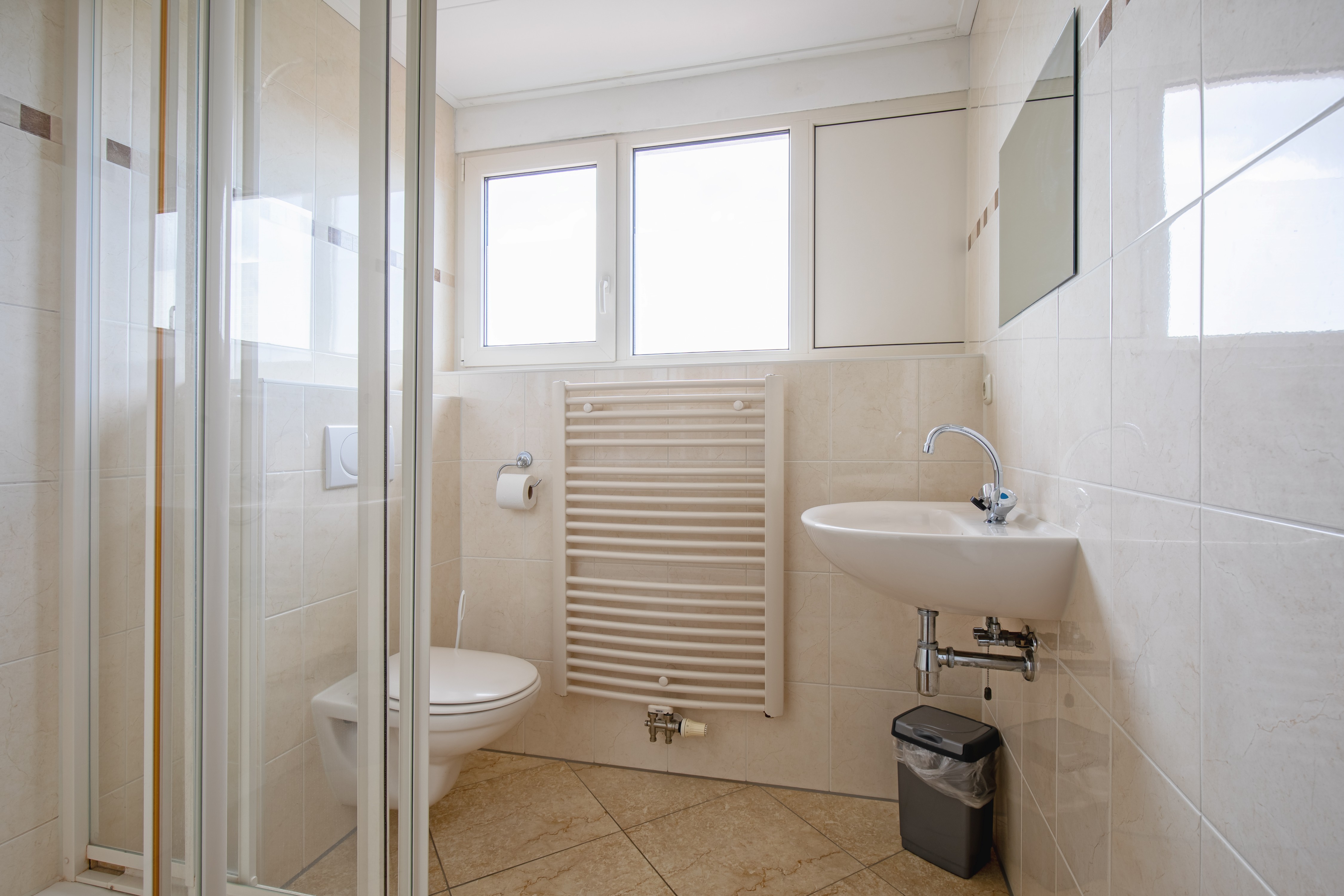 Op de eerste verdieping een badkamer met douche, toilet met wastafel